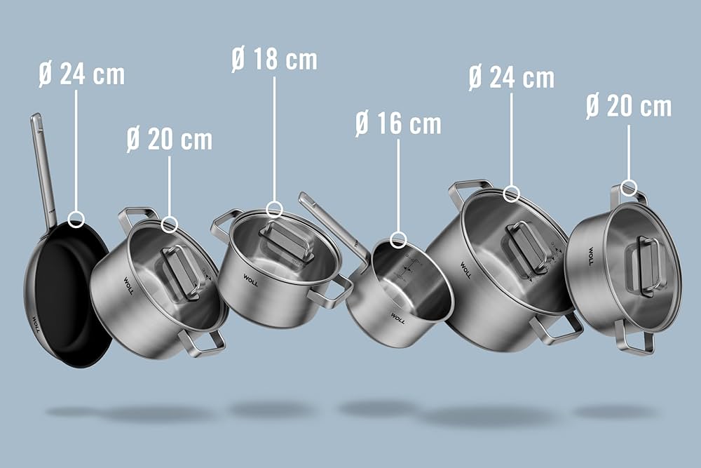 گنجایش و حجم | قابلمهها: ۱.۵ لیتر (۱۶ سانتیمتر)، ۲.۲ لیتر (۱۸ سانتیمتر)، ۳ لیتر (۲۰ سانتیمتر)، ۵.۵ لیتر (۲۴ سانتیمتر) / ماهیتابه: ۲ لیتر |