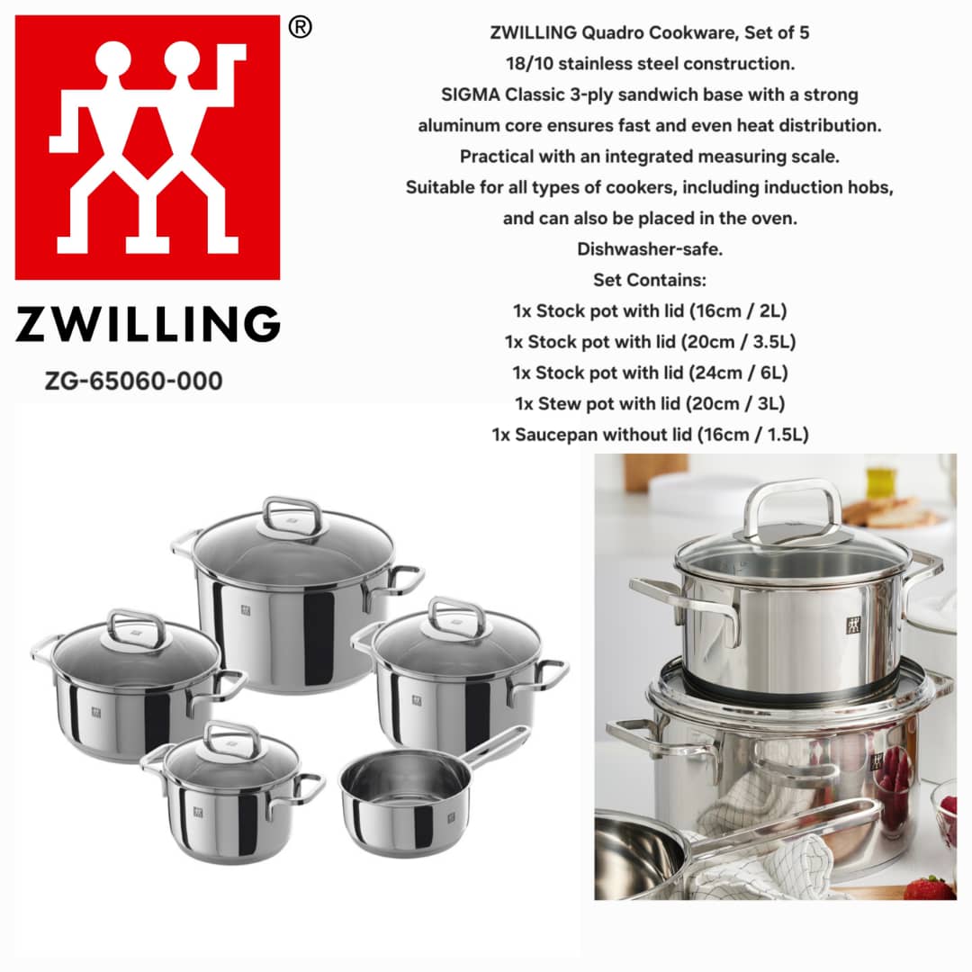 نام برند و مدل محصول | Zwilling J.A. Henckels - مدل Quadro 5-Piece Cookware Set (شماره 66800-005)، یک ست حرفهای استیل ضدزنگ با تمرکز بر پخت چندمنظوره، پرفروش در آمازون با ASIN B07H5K3Z4P. |