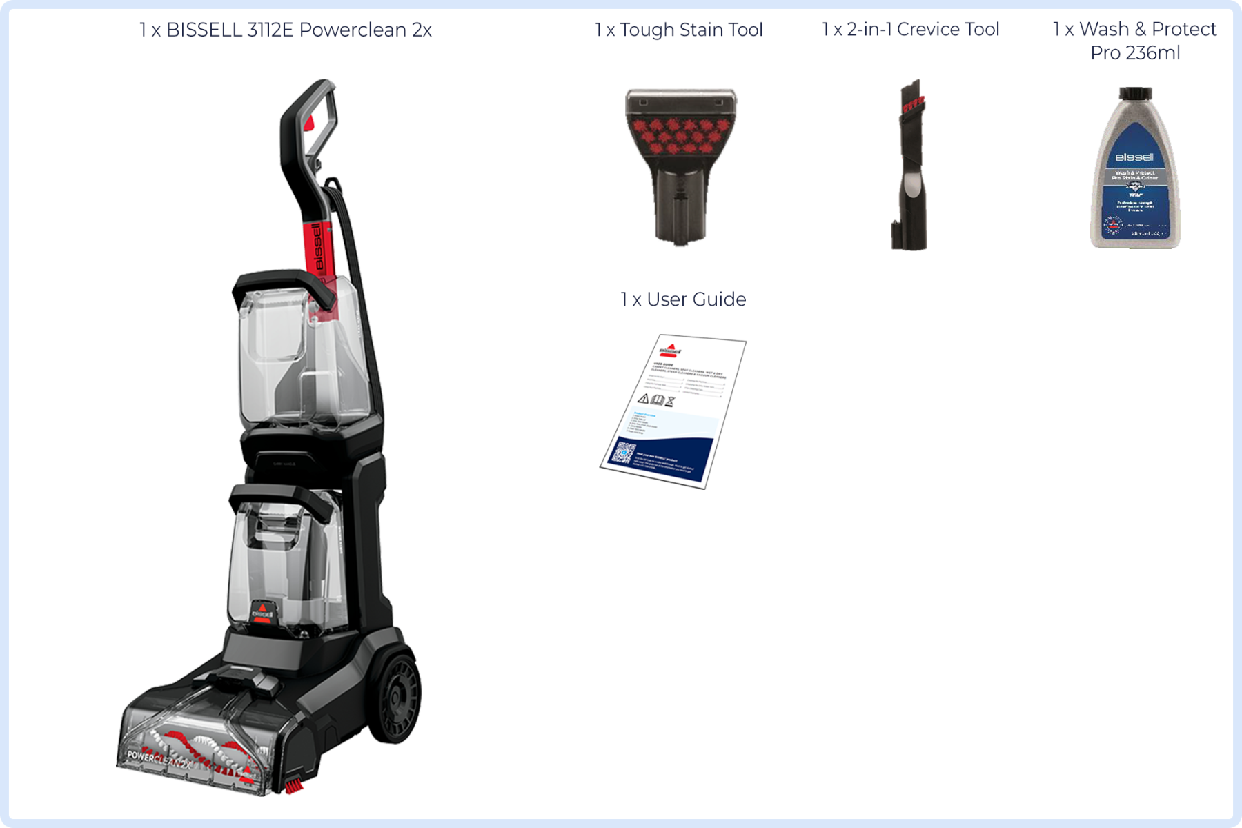 متعلقات همراه محصول | پایه اصلی، لوله 8 فوتی، Tough Stain Tool 3"، 2-in-1 Crevice Tool، nozzle جدا، brush roll، فرمول Wash & Protect Pro 1.4L، manual. |